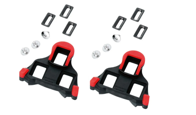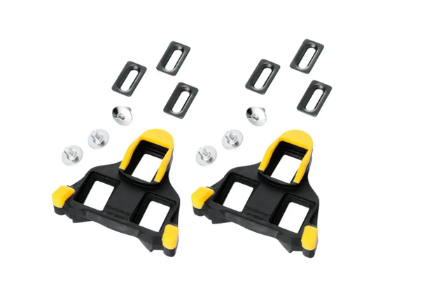 Shimano SPD-SL schoenplaatjes voor racefietspedalen. Makkelijk om mee in en uit te klikken en geven een goede grip. Er zijn drie varianten beschikbaar: geel-, blauw- en rood. Ze geven allemaal een verschillende bewegingsvrijheid.